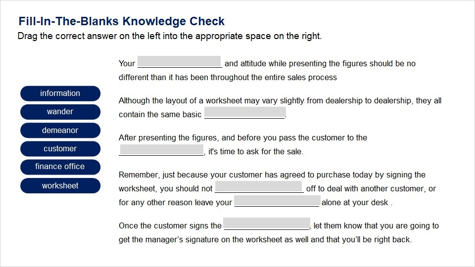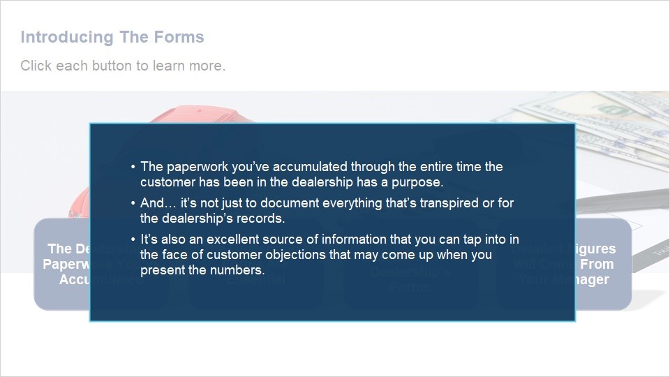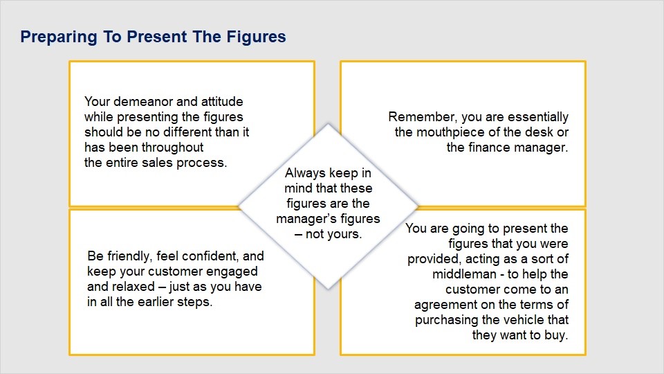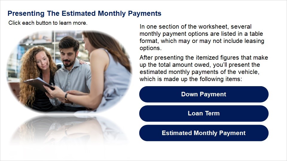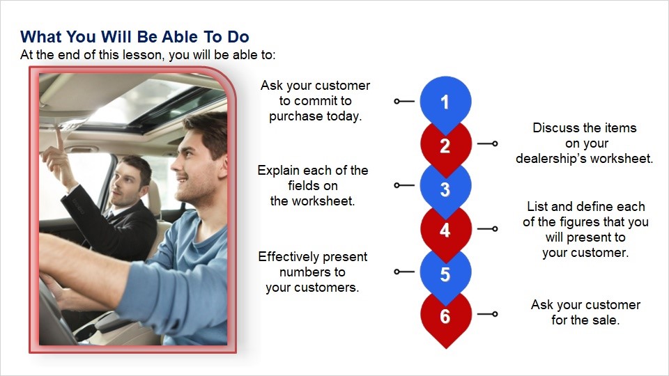 Discuss the items on your dealership’s worksheet.